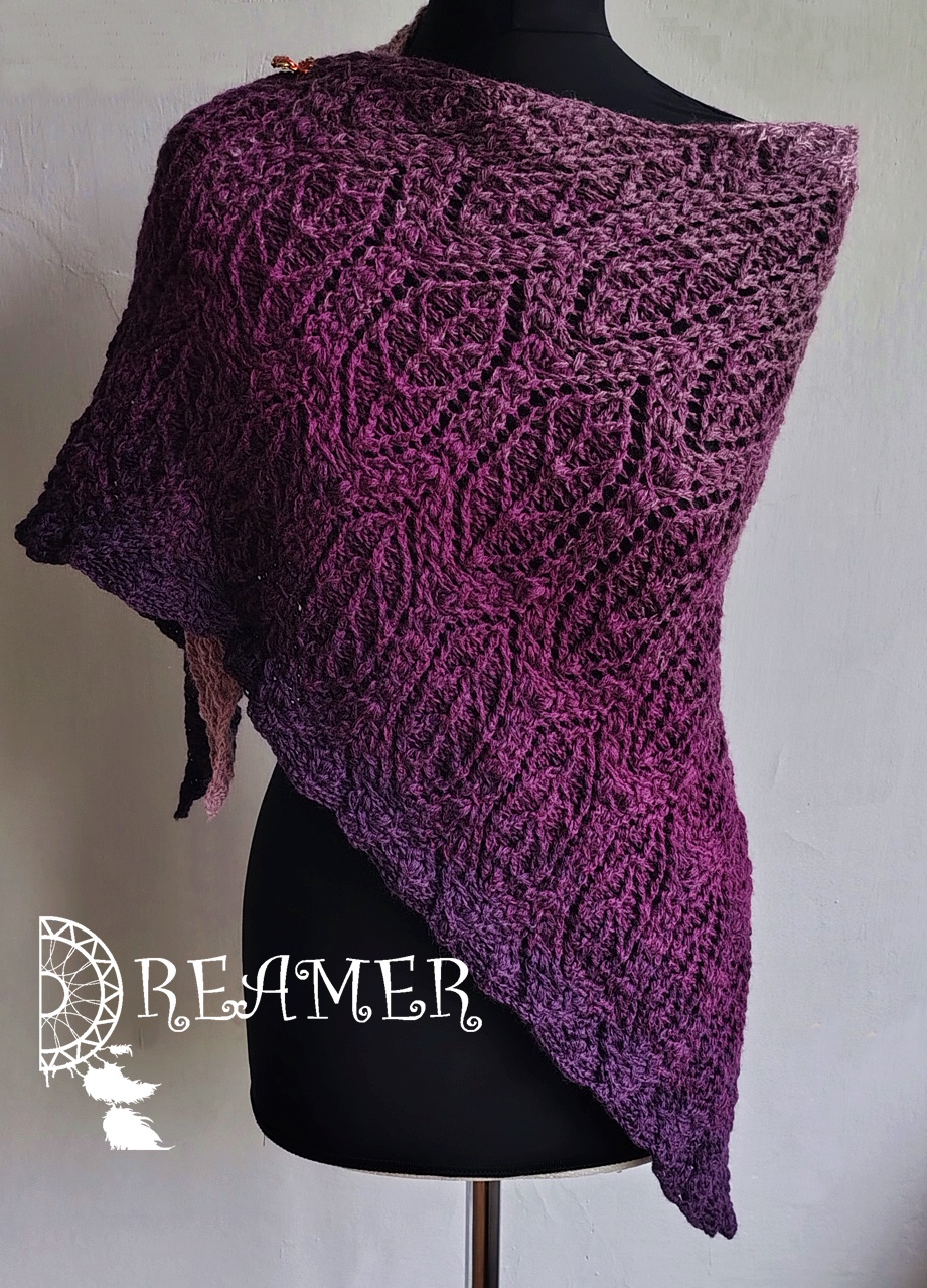 Technikalia: merino z akrylem w metrażu 1400m, kolory: wrzos, jeżyna, oberżyna oraz śliwka , szydełko 3,25 , wymiary 170 cm na 70 cm.