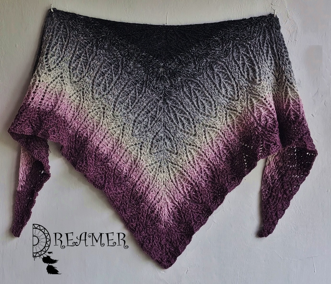 Technikalia: merino z akrylem w kolorach bardzo ciemny szary, szary, jasny szary, bardzo jasny szary, jeżyna, jeżyna, szydełko nr 3,25, wymiary 165 cm/60 cm metraż 1200 m.