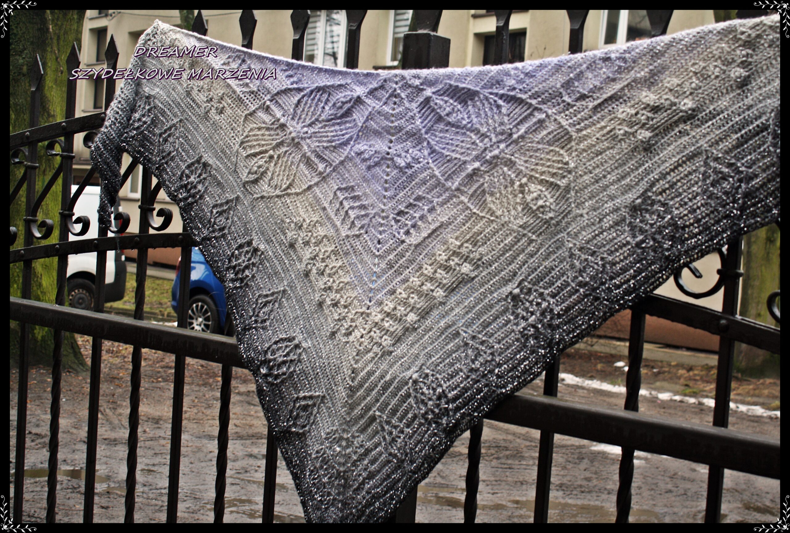 Technikalia: Włóczka Merino (50% merino, 50% akryl ) od Lilopii w kolorach lila, jasny szary, szary oraz ciemny szary melanż w metrażu 1400m, szydełko 3,5, wymiary 176 cm na 79 cm.