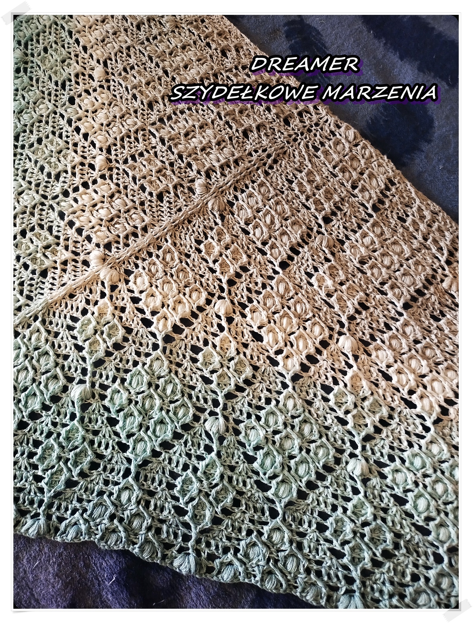 Wersja ombre: Bawełna z akrylem od Zakręcone Motki w kolorach ciepły beż, krem, pistacja, patyna w metrażu 1100 m , szydełko 3 , i osiągnęła 160 cm na 60 cm