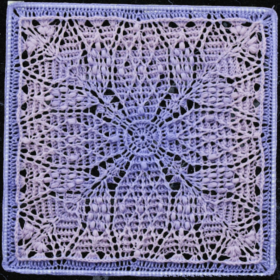 Pierwowzór powstał z włóczki Bawełna z akrylem w kolorach lawenda oraz fiołek od Kokonki Motki ombre, metraż ok. 280 m, szydełko nr 2,50 , bok 30 cm.